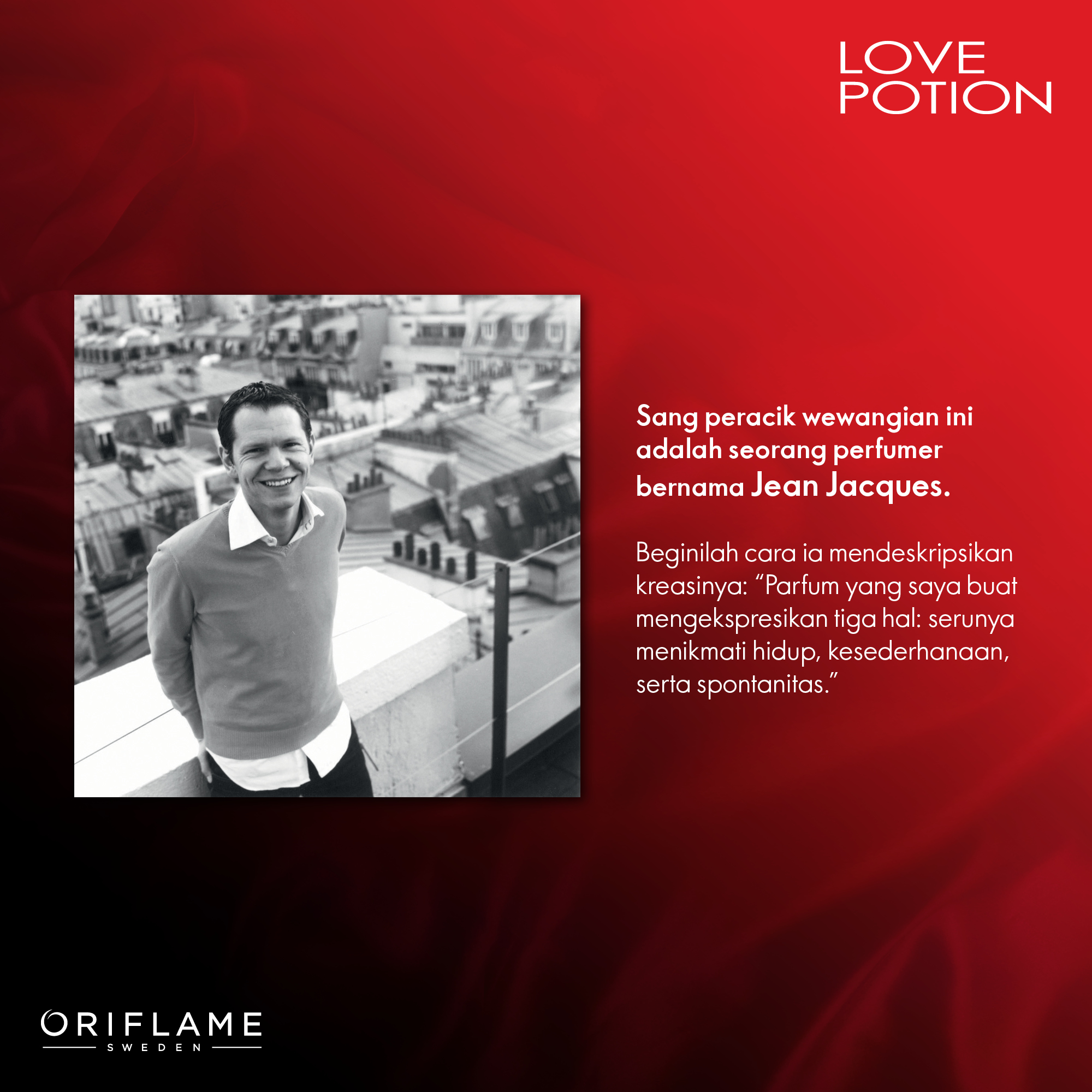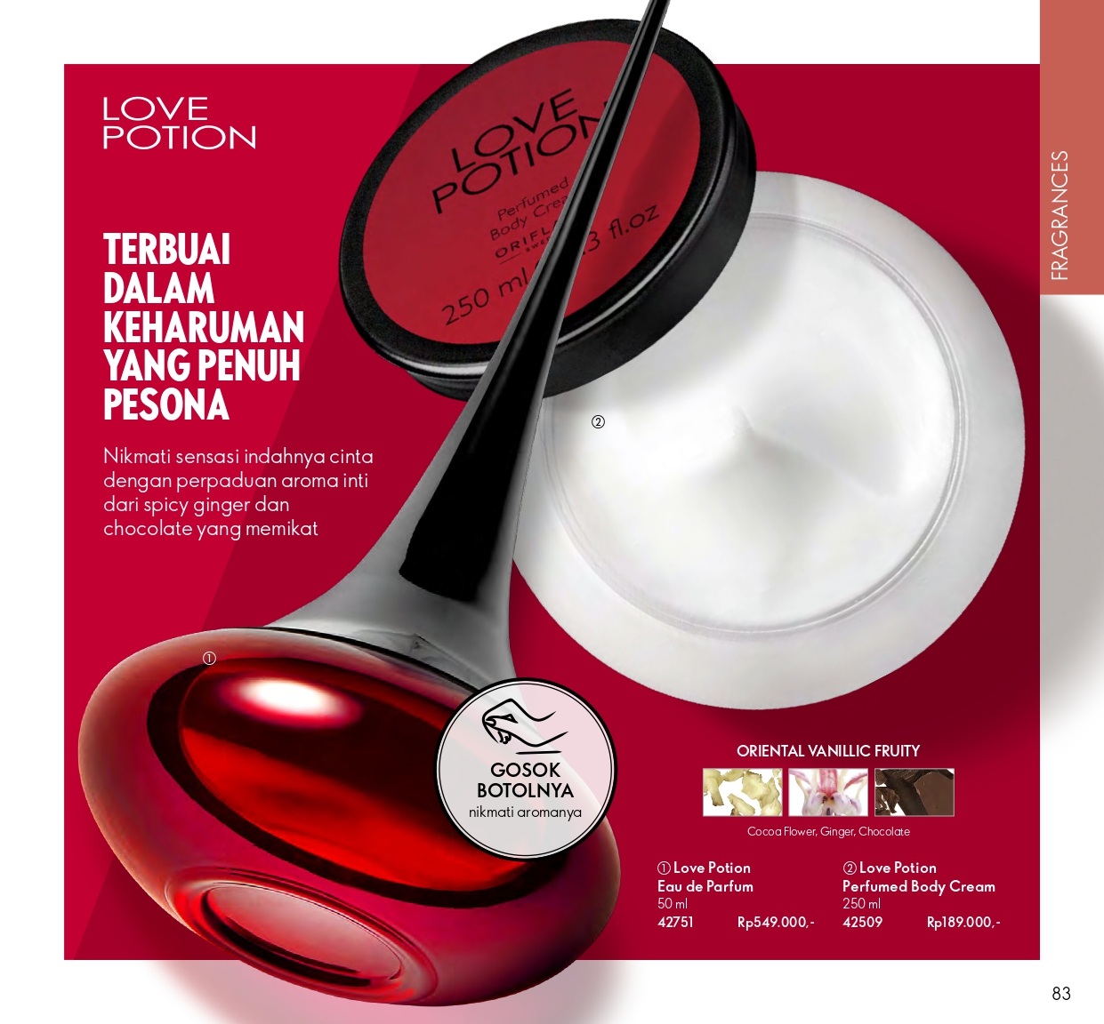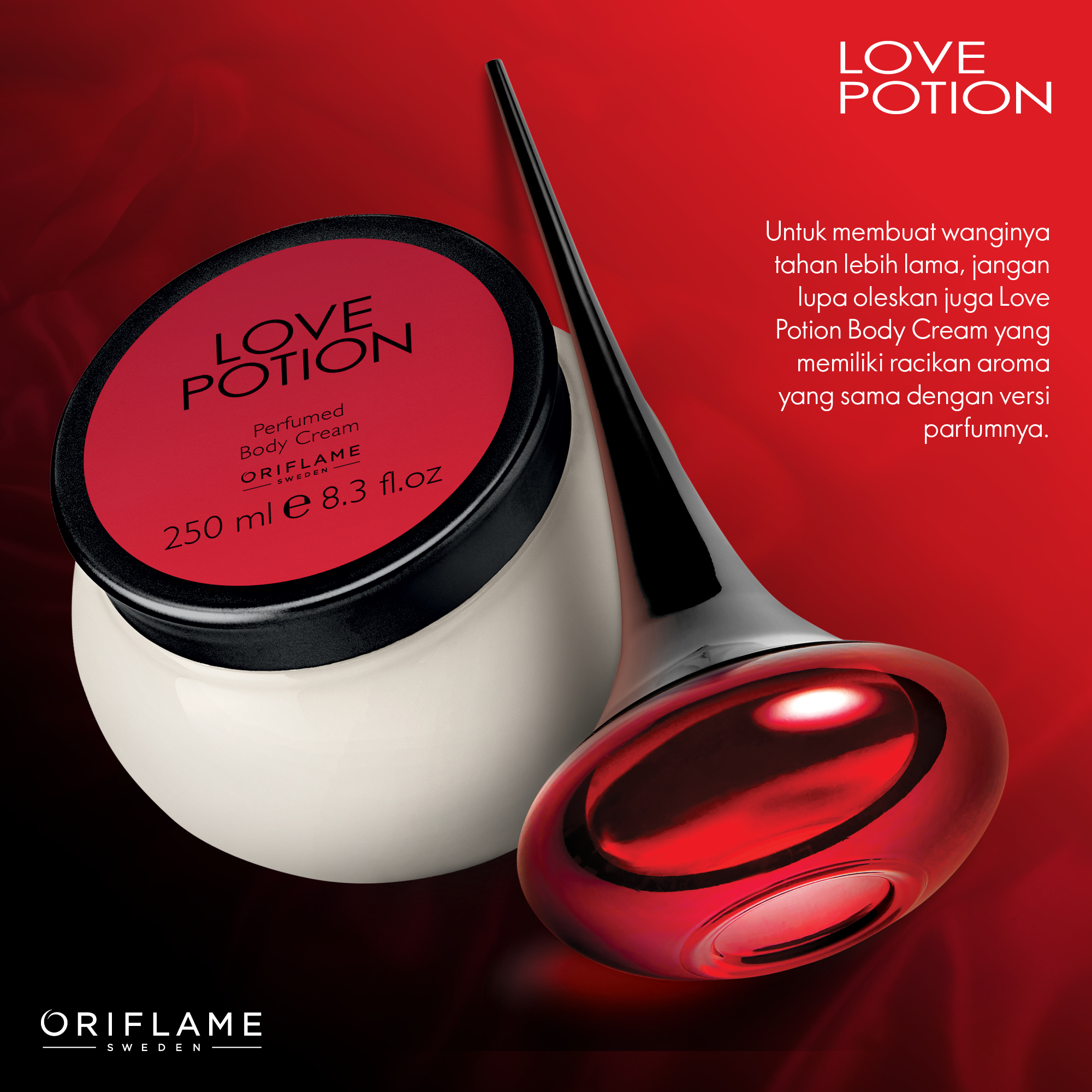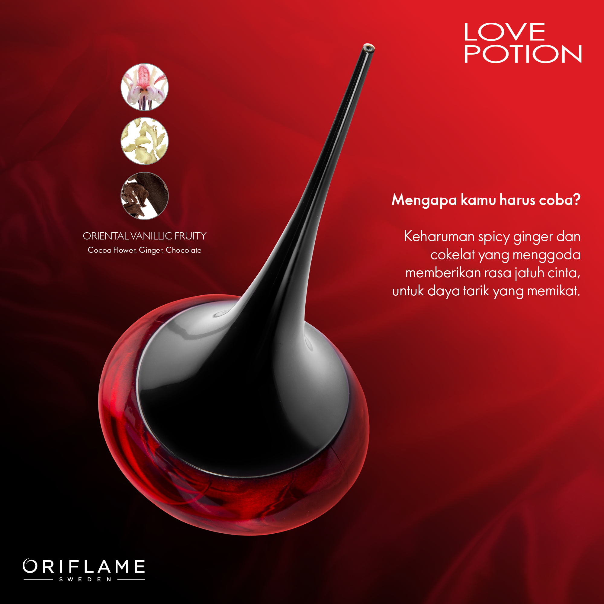 Parfum dengan aroma Oriental Vanillic Fruity yang menggoda, bersiaplah menjadi pusat perhatian! Keharuman spicy ginger, cocoa blossom dan chocolate yang menggoda, memberikan rasa jatuh cinta untuk daya tarik yang memikat, tersedia juga Body Cream Perfume Love Potion.