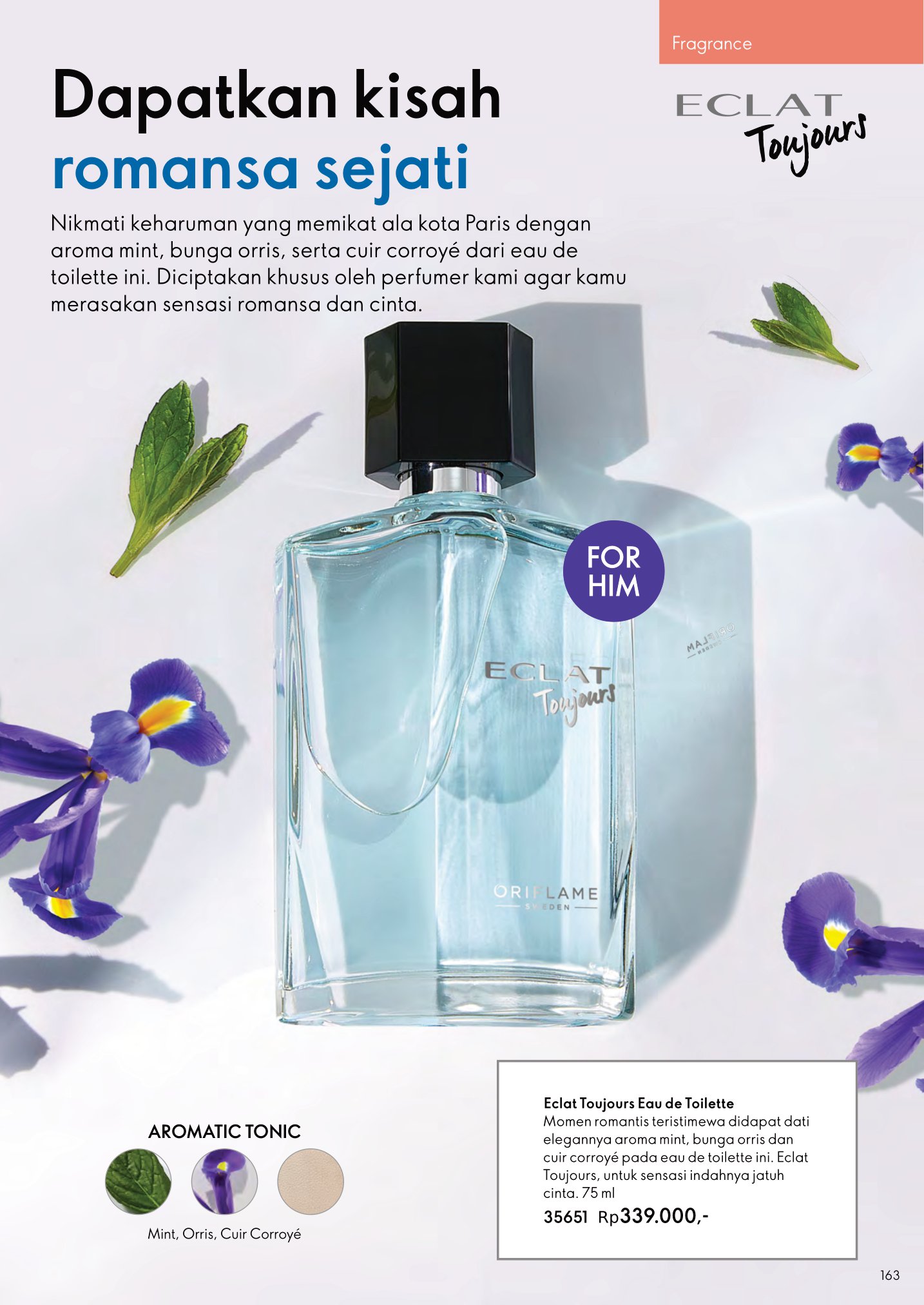 Parfum eclat ini merupakan wewangian floral woody yang memadukan blackcurrent, jeruk mandarin dan tagete pada top note, sedangkan untuk intinya sangat kental dengan aroma bunga melati (jasmine) serta aroma sandalwood dan amber yang harmonis pada tingkat lebih dalam lagi. Harga normal Rp519.000,-