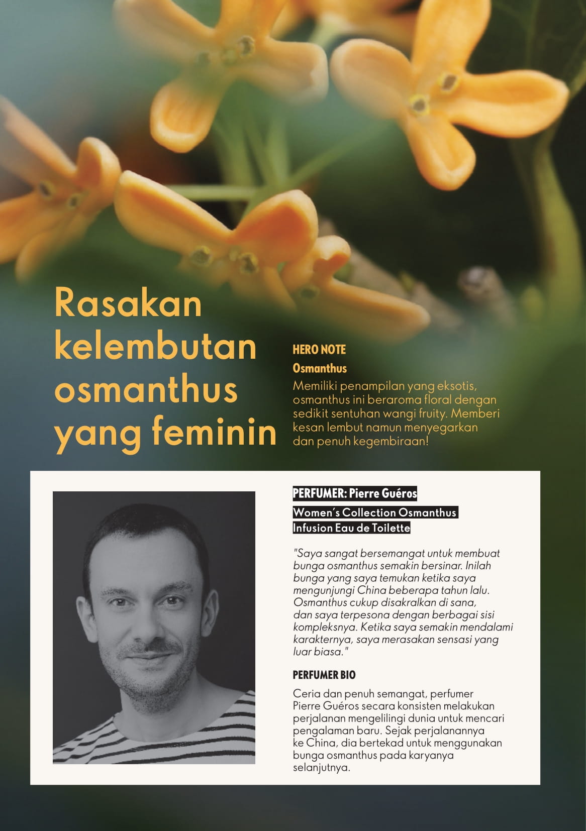 Osmanthus Infussion Bunga osmanthus jadi inti dari eau de toilette terbaru Women’s Collection. Dipilih karena keseimbangan antara aroma floral & fruity yang lembut menyegarkan. normal Rp319.000,-
