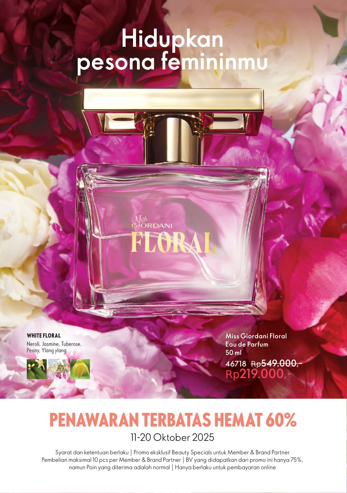 Komposisi yang sempurna dan indah dari bunga neroli, melati, tuberose, peony, dan ylang ylang mengangkat dan menyempurnakan aroma khas wewangian Miss Giordani eau de Parfum yang memikat. HEMAT 60% Rp219.000,- Harga normal Rp529.000,- berlaku 11-20 Oktober 2025
