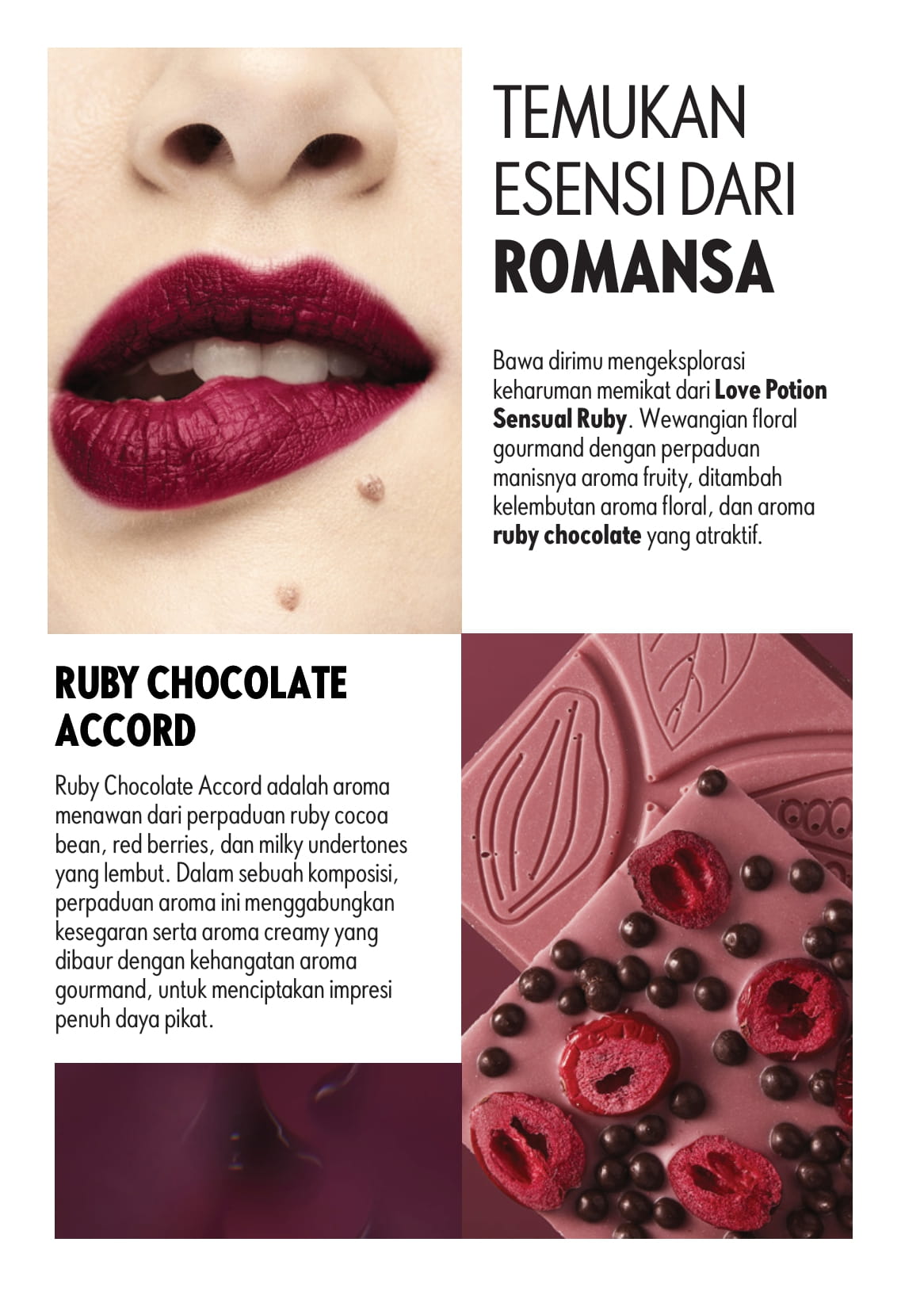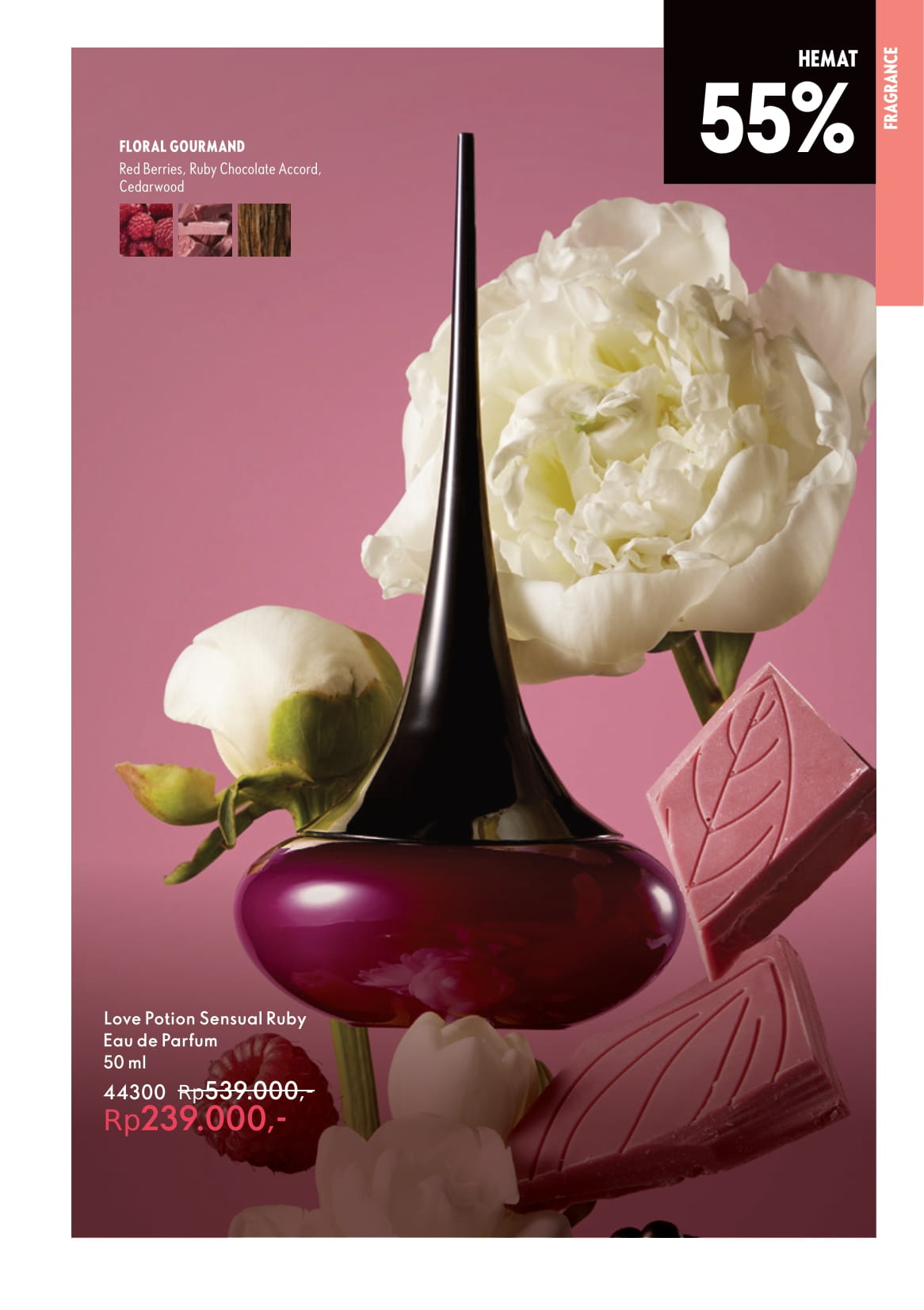 Aroma yang memikat dan menggoda! Wewangian floral gourmand dengan sentuhan buah dari Red Berries, karakter bunga yang banyak dari White Flower Bouquet yang dipadukan dengan ciri khas Ruby Chocolate yang menggoda. Diakhirnya, ia meninggalkan jejak aroma musk yang lembut dari Cedarwood. Harga promo Rp239.000,- normal Rp539.000,-