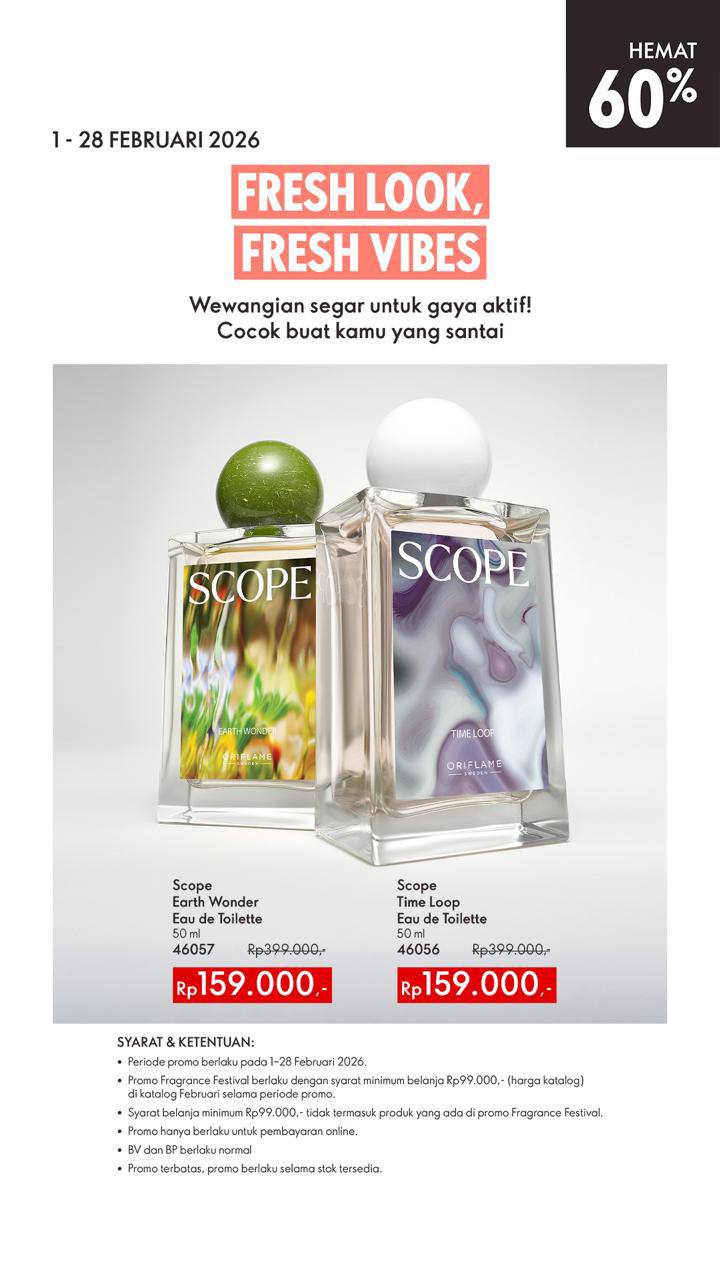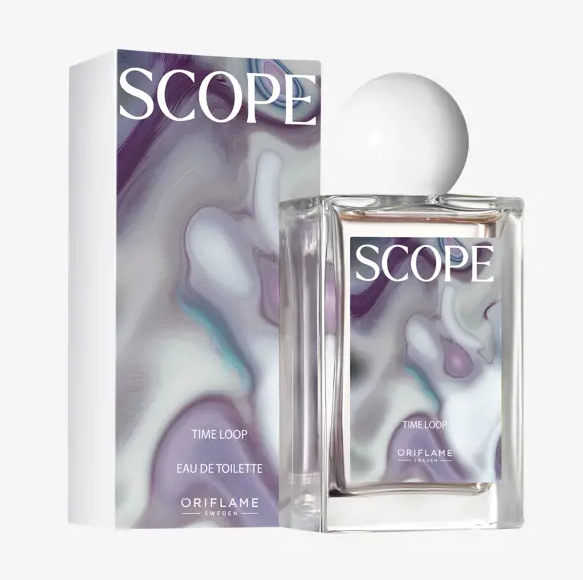 Memperkenalkan wewangian terbaru Oriflame Scope Time Loop EDT, aroma fruity woody yang memberi rasa nyaman, menenangkan dan bahagia. Bahan utama Joyful Accord yang merupakan perpaduan smooth vanilla, sea breeze, jasmine, dan musk.